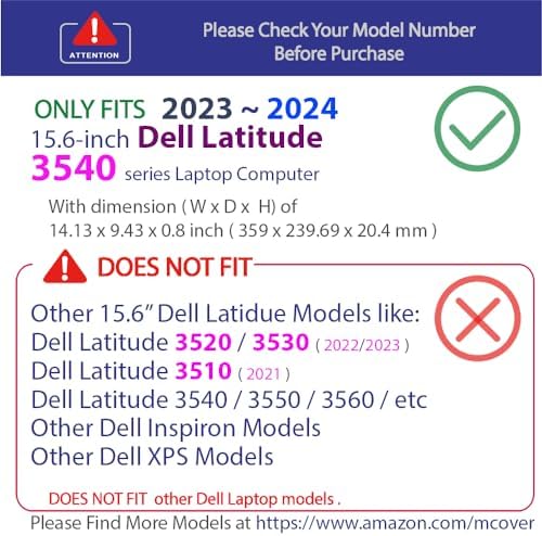 ☞⚠❤️?⭕️‼️ NOTE: Before placing order, PLEASE make sure to verify your laptop model number as this case is MODEL specific and NOT interchangeable. ‼️⭕️?❤️⚠☜    ❌‼️?⭕️ NOT fitting other 15-inch Dell Latitude laptops ( like Latitude 3510 / 3520 / 3530 ). NOT compatible with ANY other Dell laptops as well. ❌‼️?⭕️    Made of high-quality translucent polycarbonate material which is shatter-proof and will protect your 2023-2024 15.6" Dell Latitude 15 3540 series Laptop Computer all around    Designed to perfectly fit the 2023-2024 15.6" Dell Latitude 15 3540 series Laptop Computer with dimension of 14.13 x 9.43 x 0.8 inch ( 359 x 239.69 x 20.4 mm )    2-piece light-weight ( 12 oz or 340 g ) shell easily snaps on and off.